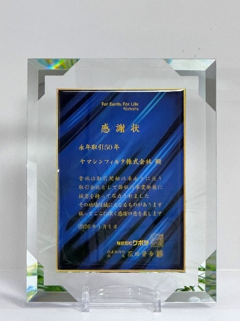 ヤマシンフィルタ株式会社(代表取締役社長執行役員 山崎敦彦 以下、当社)は、株式会社クボタ(以下クボタ)より、永年取引50年の感謝状を拝受いたしましたので、お知らせします。
