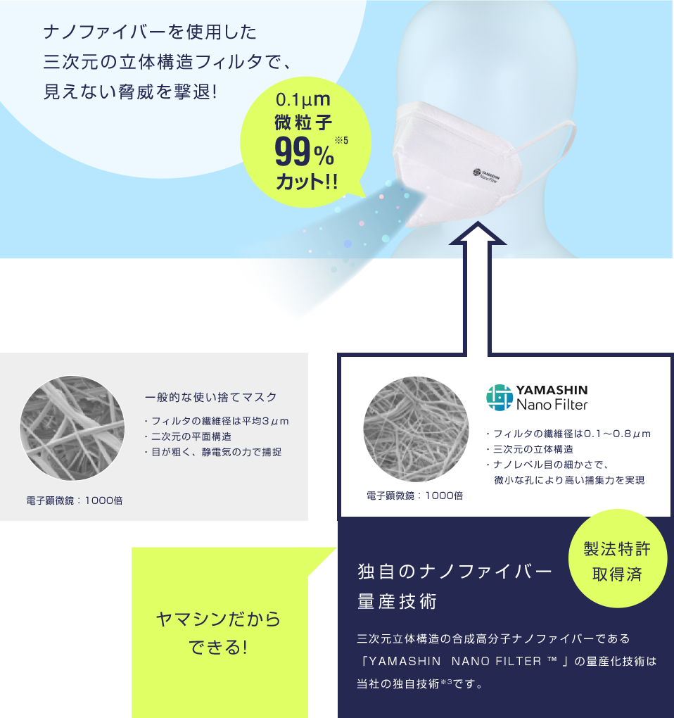 一般的なマスクに使用されるフィルタの繊維径は平均3μmで二次元の平面構造であるのに対し、当社独自の特許技術sup{※3}によるナノファイバーで作られた「YAMASHIN NANO FILTER™」の繊維径は0.1~0.8μmのナノサイズで三次元の立体構造となっています。「YAMASHIN NANO FILTER™」は、数億の超微細な孔(直径数十nm)が空いている多孔体を形成しており、同素材を使用した「ヤマシン・フィルタマスク」は、超微粒子までも効率的に捕集する、究極のマスク製品です。